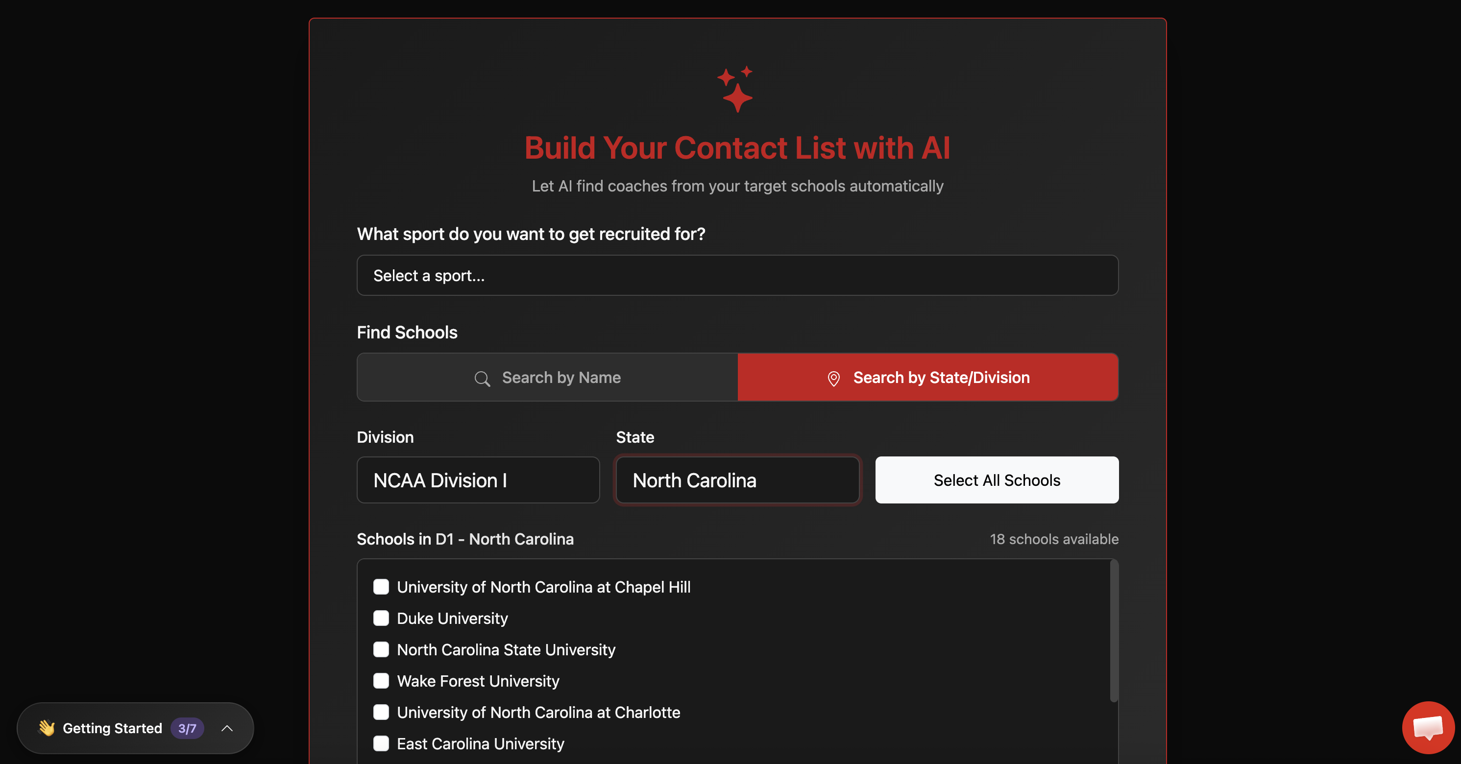 - Division level (D1, D2, D3, JUCO, NAIA, and more)